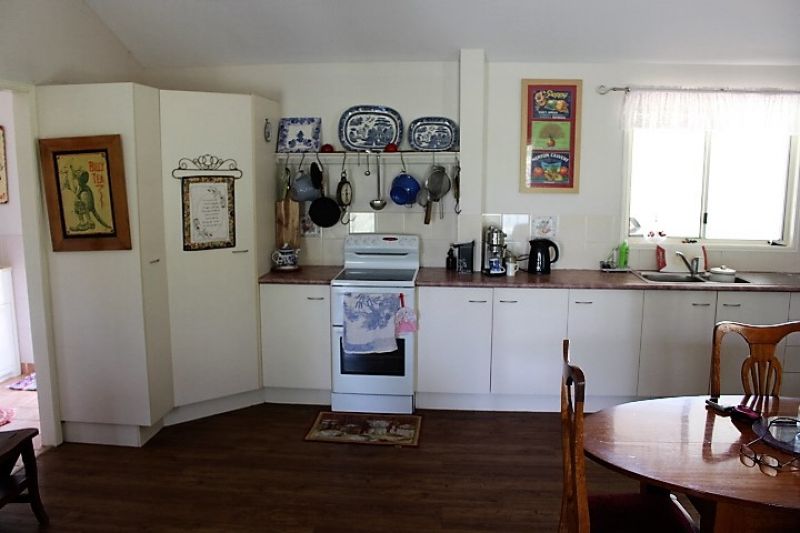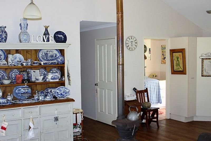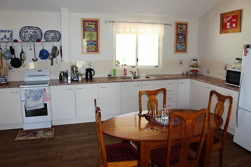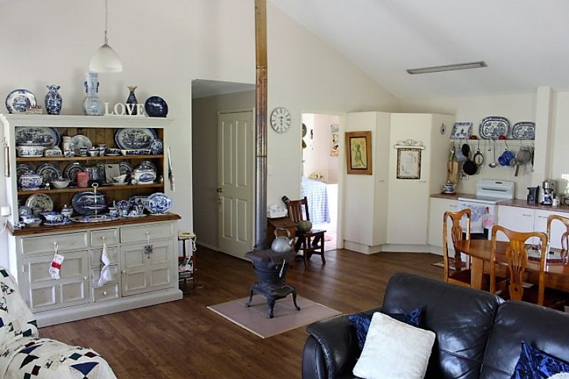 Open plan living /dining and kitchen with raked ceilings and a lovely wood burning heater for the cooler months and A/C for the warm months.