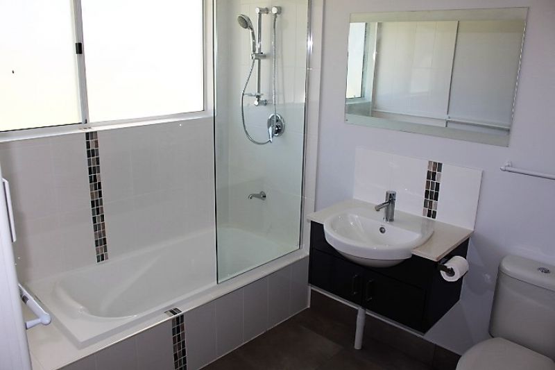 Good size well laid out family bathroom with modern dcor.