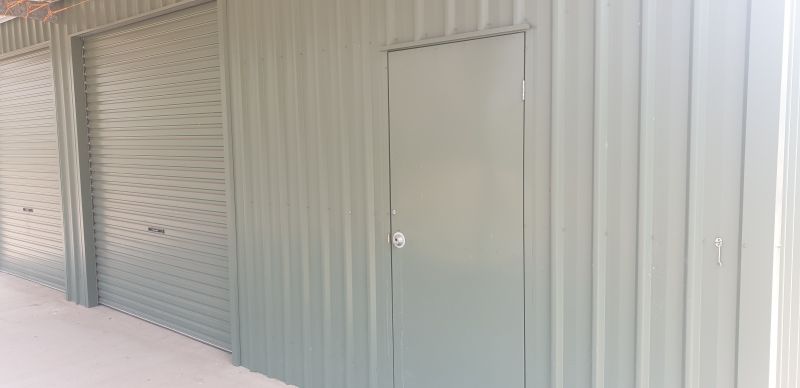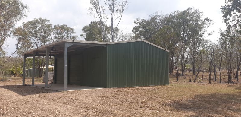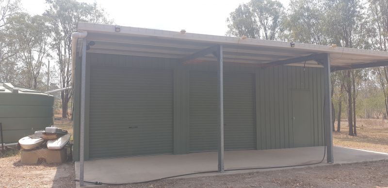 Shed is 3 bays on a concrete slab with 2 roller doors and a PA door.