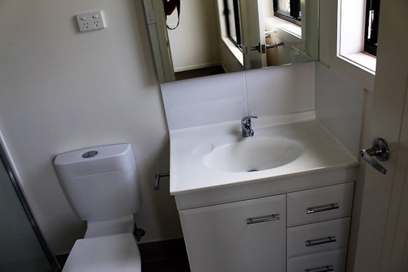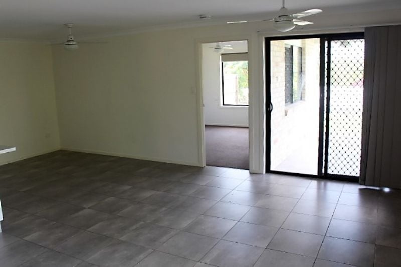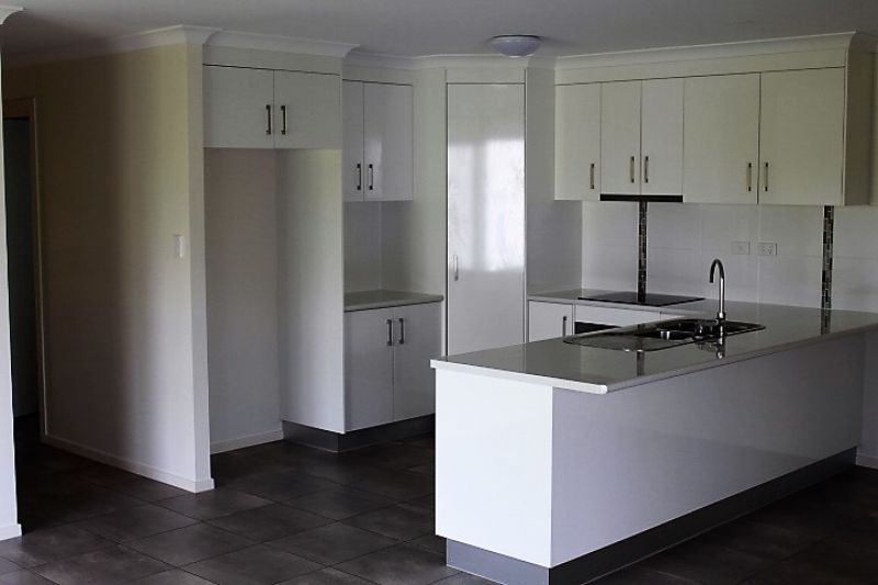 Open plan living/dining and kitchen with plenty of cupboard space and bench tops.